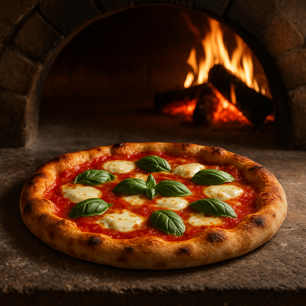 Notre four centenaire en pierre réfractaire, chauffé au bois de chêne, atteint 400°C. La pizza cuit en 2-3 minutes, acquérant ce goût fumé inimitable.